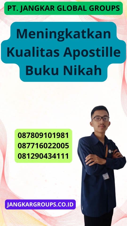 Selanjutnya Jika Anda membutuhkan Apostille buku nikah dan berkualitas tinggi, Jangkar Global Groups adalah pilihan yang tepat. Maka dengan layanan jasa yang cepat, handal, dan profesional, kami akan membantu Anda menyelesaikan proses pengurusan Apostille dengan lancar dan tanpa masalah. Maka Percayakan kebutuhan pengurusan Apostille buku nikah Anda kepada Jangkar Global Groups. Hubungi Jangkar Global Groups sekarang juga untuk memulai proses Apostille Anda! Baca Juga : Meningkatkan Kualitas Apostille Buku Nikah