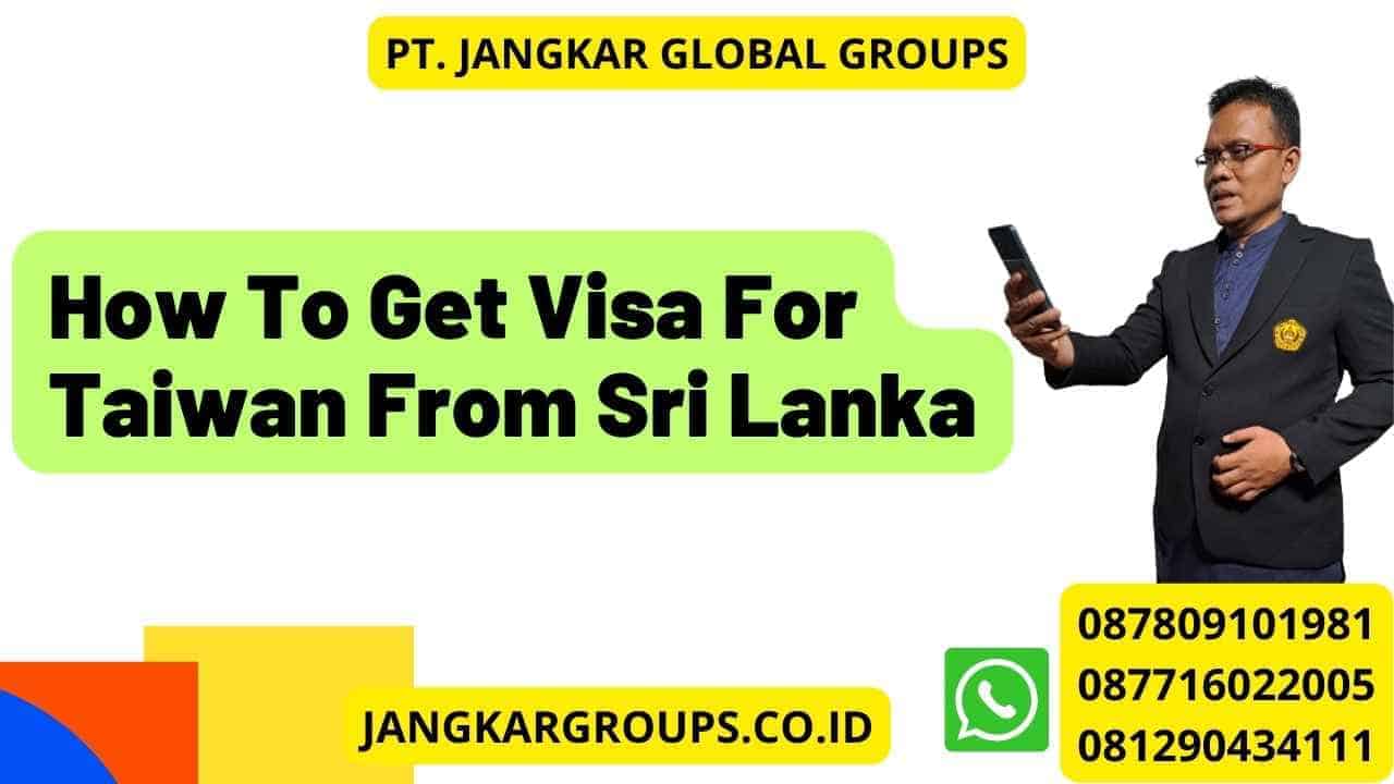 Aplikasi visa Taiwan dari Sri Lanka biasanya di urus oleh Kedutaan Besar atau Kantor Perwakilan Ekonomi dan Budaya Taipei di Sri Lanka. Anda perlu menghubungi mereka untuk mendapatkan informasi terkini mengenai persyaratan visa, prosedur aplikasi, dan informasi kontak yang relevan. Alamat dan nomor telepon dapat di temukan di situs web resmi mereka.
