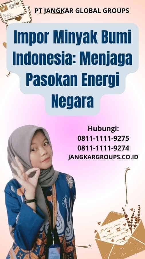 Indonesia mengimpor berbagai jenis minyak bumi untuk memenuhi kebutuhan energinya. Beberapa jenis minyak bumi yang sering di impor adalah minyak mentah, minyak di esel, minyak jet, minyak bakar, dan minyak pelumas. Minyak mentah merupakan minyak bumi yang belum di proses dan biasanya di gunakan untuk di olah menjadi berbagai jenis produk minyak bumi. Maka, Minyak di esel di gunakan sebagai bahan bakar untuk kendaraan bermotor dan juga generator listrik. Sehingga, Minyak jet di gunakan sebagai bahan bakar pesawat terbang. Dan, Minyak bakar dan pelumas di gunakan sebagai bahan bakar untuk mesin industri dan transportasi laut.