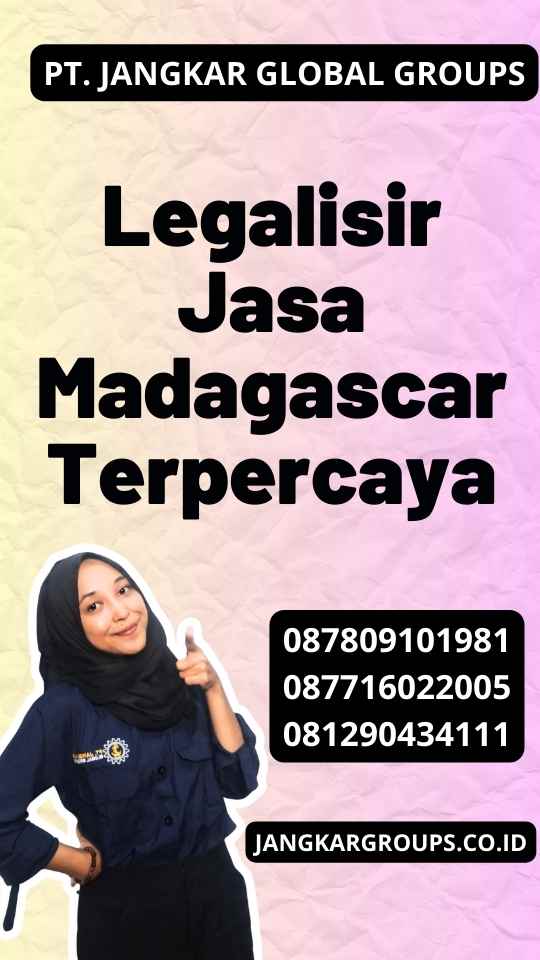 Untuk kebutuhan legalisir dokumen ke Madagascar, percayakan kepada Jangkar Global Groups. Kami siap membantu Anda dengan layanan yang profesional dan terpercaya. Hubungi kami untuk mendapatkan informasi lebih lanjut dan konsultasi mengenai proses legalisir dokumen Anda!