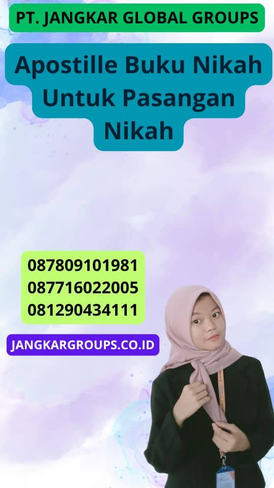Layanan Jangkar Global Groups adalah layanan dari PT. Jangkar Global Groups yang memiliki pengalaman dalam mengurus legalisasi buku nikah dan Apostille nikah, termasuk untuk pernikahan campur dengan WNA. Sehingga, Dengan tim ahli yang berpengalaman dalam bidang ini, Jangkar Global Groups siap membantu. Oleh karena itu, Anda melalui setiap langkah dari proses ini dengan profesionalisme dan kepercayaan.