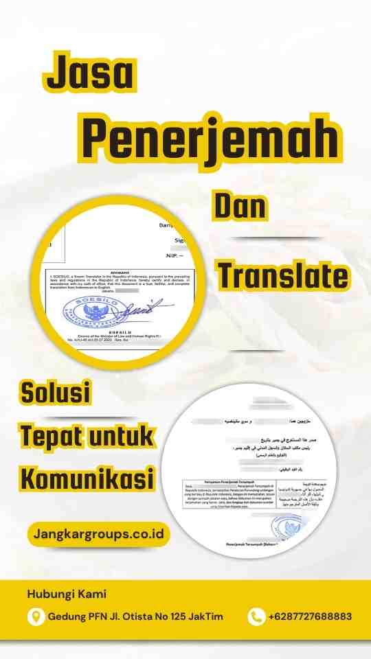 Jangan biarkan hal itu terjadi. Jadikan investasi pada penerjemah tersumpah Inggris-Indonesia dari Jangkargroups sebagai langkah bijak. Dengan pengalaman dan legalitas yang terjamin, Jangkargroups tidak hanya memberikan terjemahan yang akurat, tetapi juga validitas hukum yang Anda butuhkan.